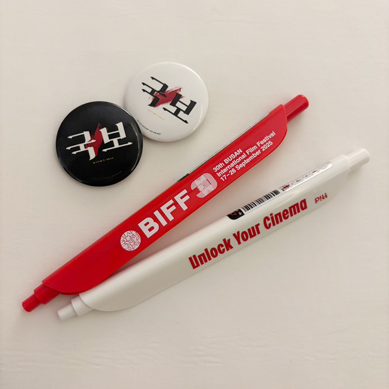 ①映画『国宝』韓国版ロゴ缶バッジ(白)&釜山国際映画祭オフィシャルクリップペン(赤)のセット
