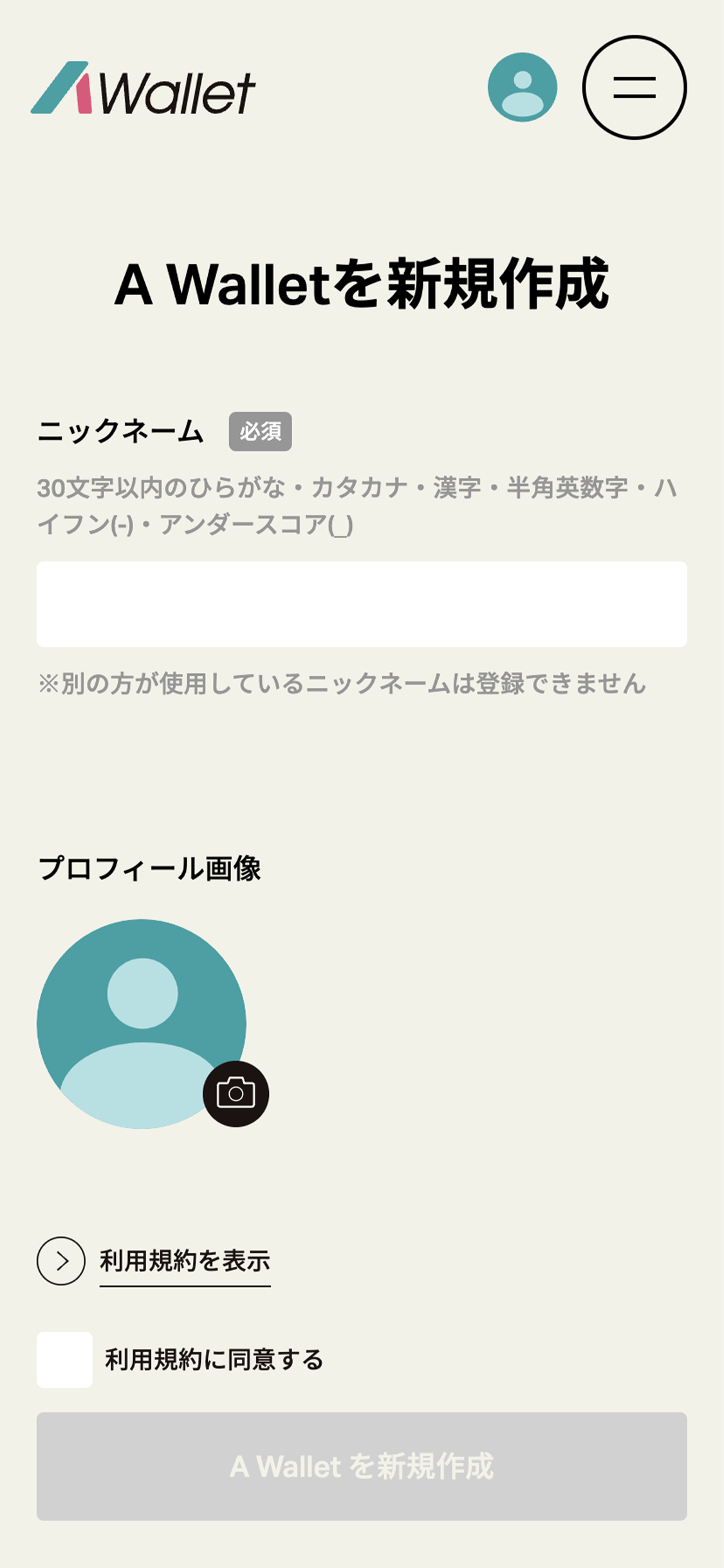 ④ニックネームとプロフィール画像を設定し、「A Walletを新規作成」ボタンを押す