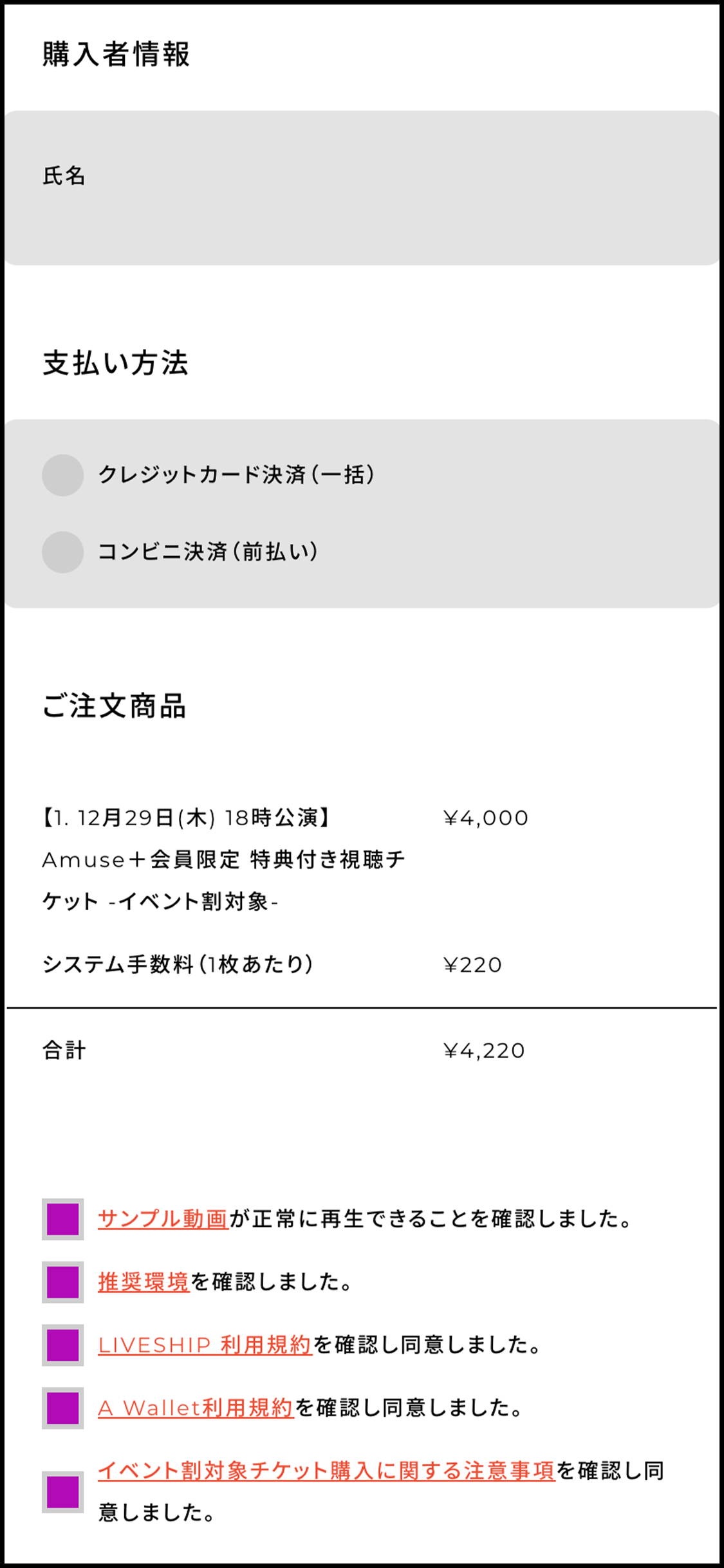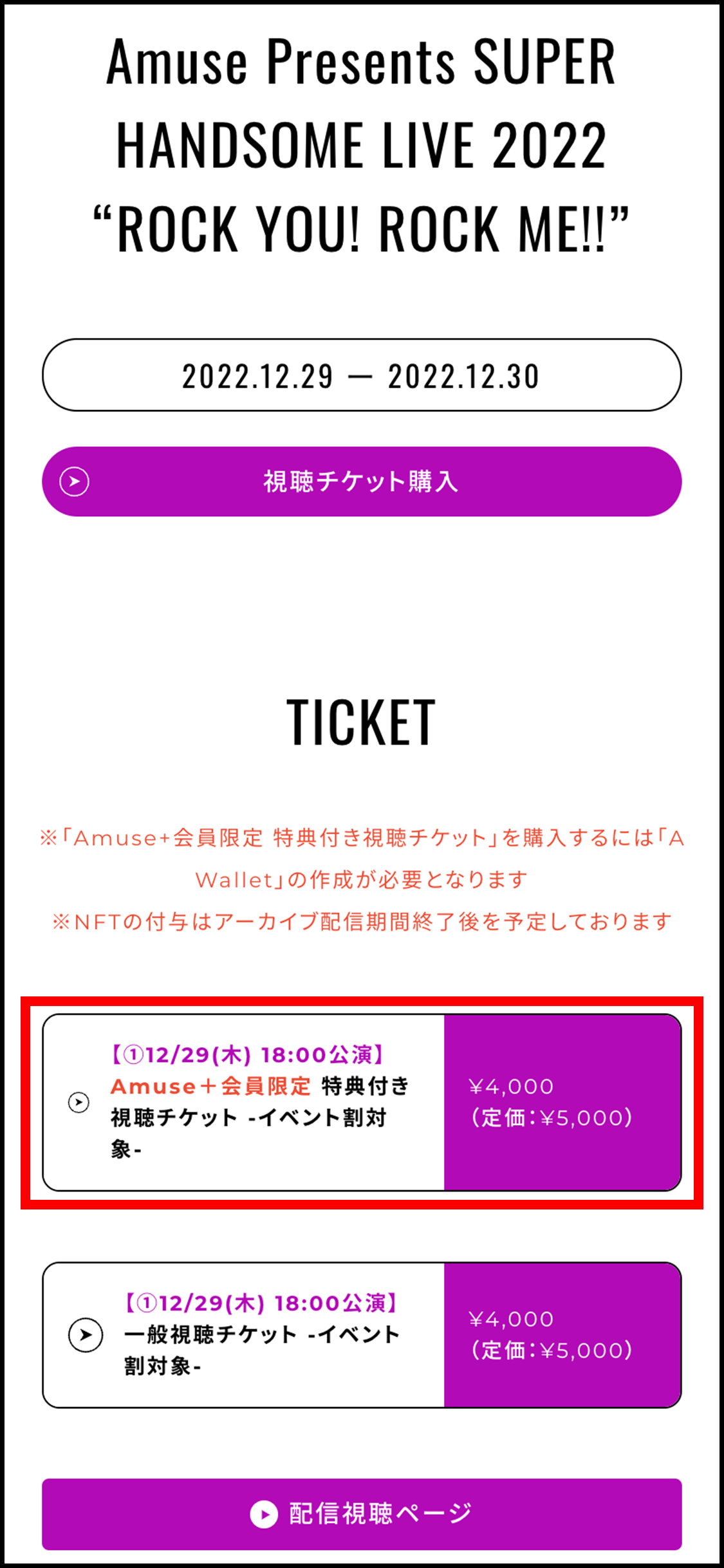 ①Amuse+有料コース(ライトコース/プレミアムコース)に登録済みのA!-ID(メールアドレス)にてLIVESHIPへログインし「Amuse+会員限定 特典付き視聴チケット」を選択※公演日程が複数ございますので、お間違えのないようご注意ください。